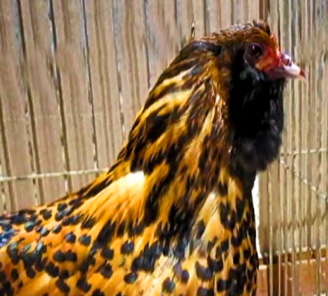 Gefieder des Eulenbarthuhns goldlack, Geflügelschau Ulm 2012 |